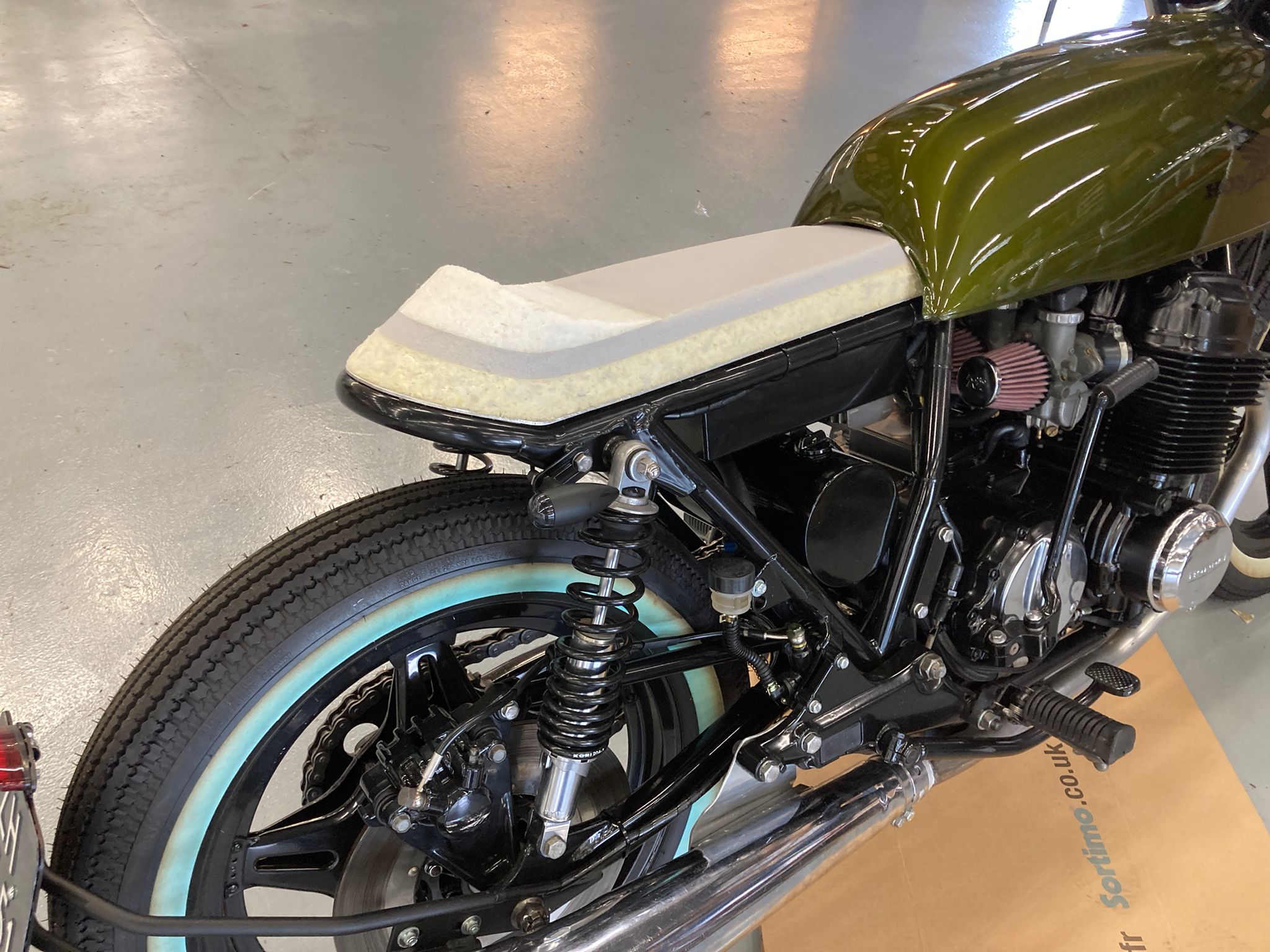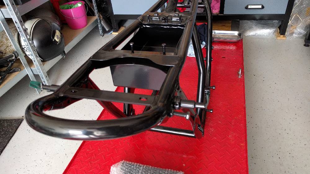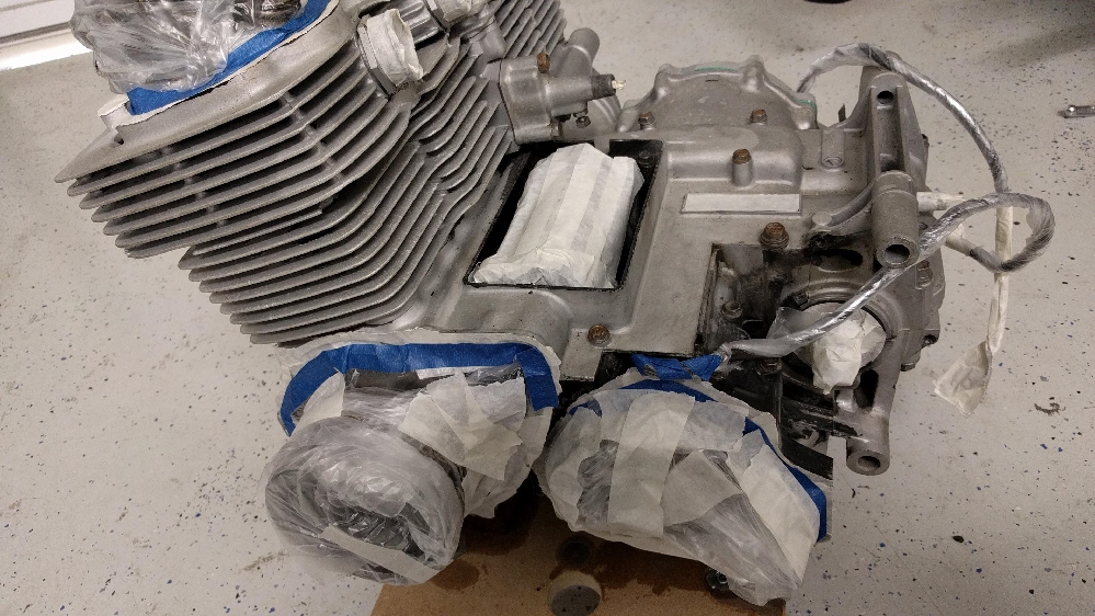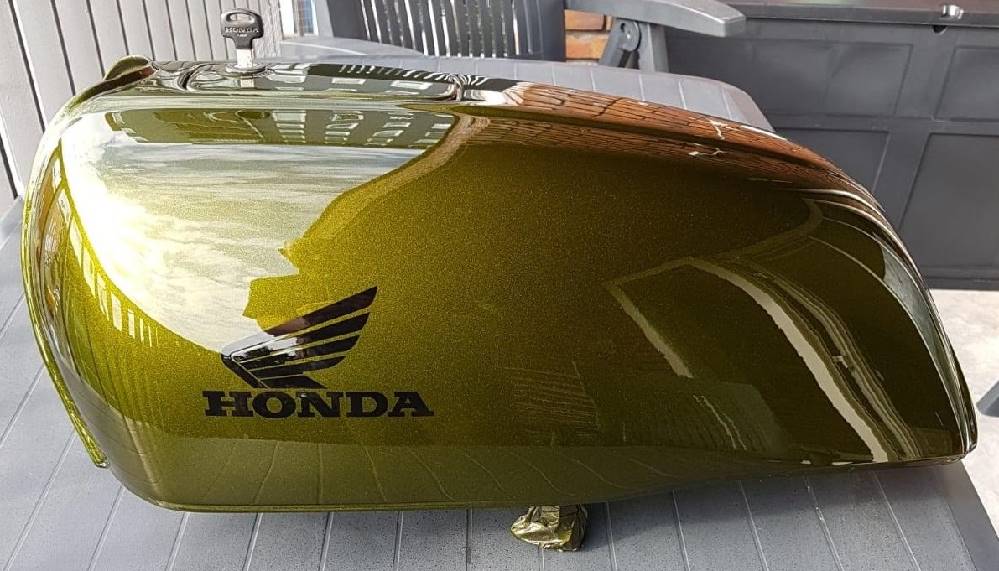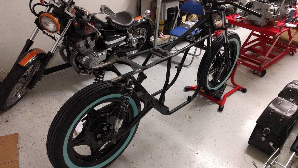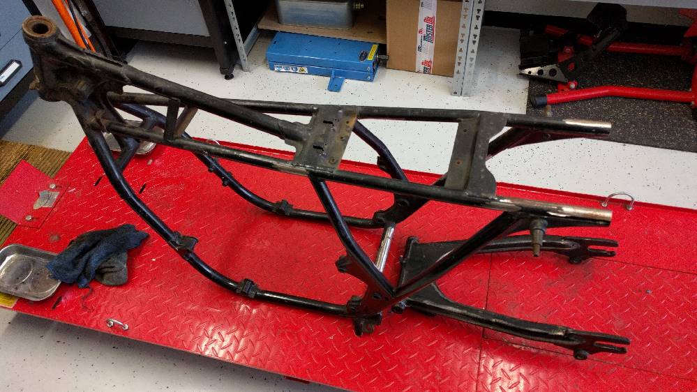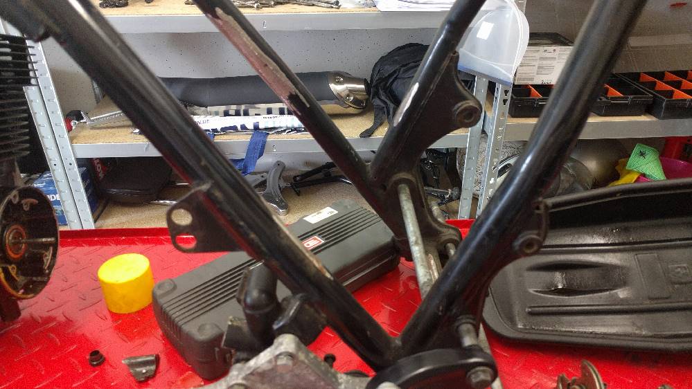 De brandstof tank was niet aanwezig, achteraf bleek het complete gedeelte waar het schakelmechanisme mee verbonden is te ontbreken. Ook zat er geen stuur bij en was er een voorpoot krom. Op de foto's hier onder zie je hoe we de motor